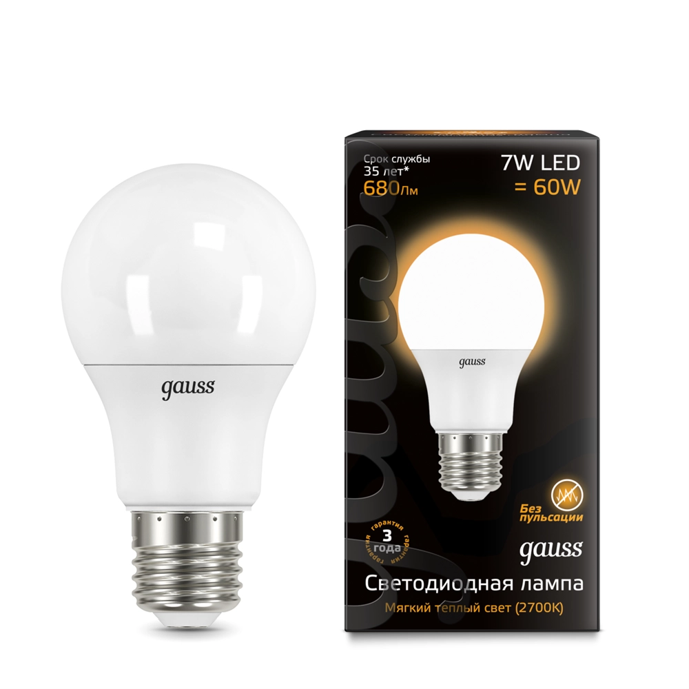 Gauss A60 7W 680lm 3000K E27 LED 1/10/50 102502107 лампа