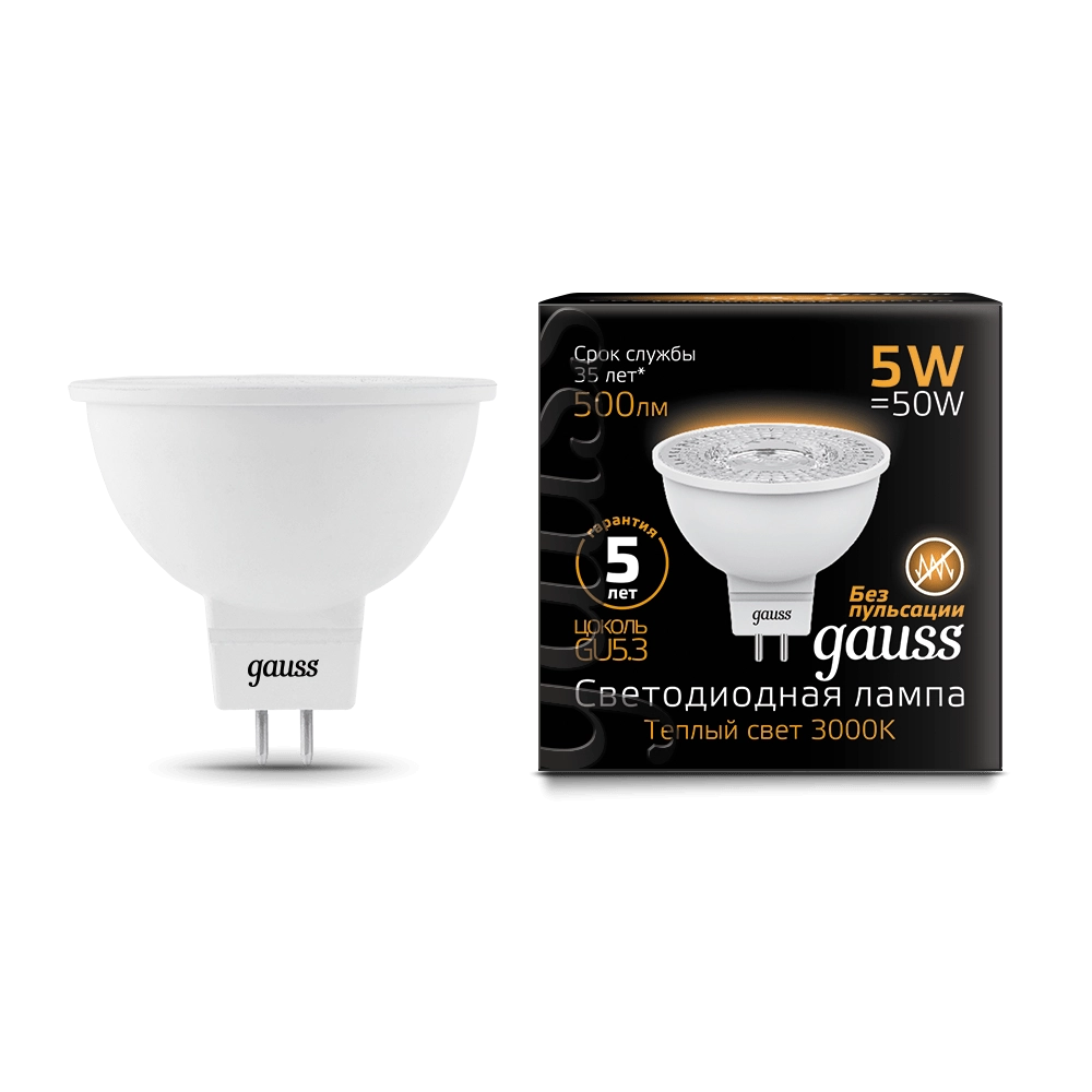 Gauss MR16 5W 500lm 3000K GU5.3 LED 1/10/100 101505105 лампа