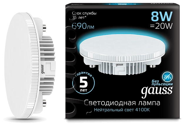 Gauss GX53 8W 690lm 4100K LED 1/10/100 108008208 лампа