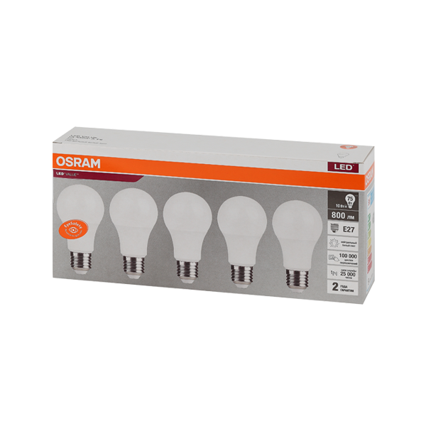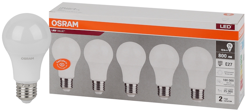 Лампа светодиодная OSRAM LED Value A, 800лм, 8,5Вт (замена 75Вт), 4000К (нейтральный белый свет). Цоколь E27, колба A. Исполнение колбы матовое, пластик. Напряжение питания 220-240В.